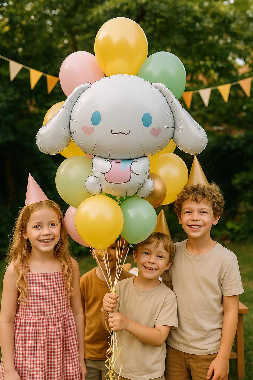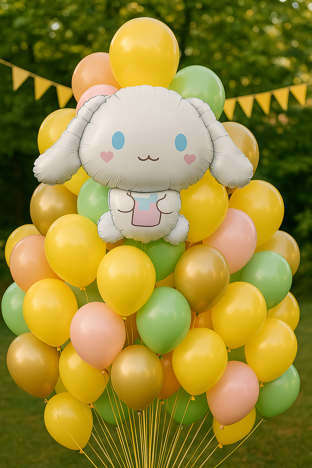 - Balon foliowy przedstawiający uroczego króliczka z dużymi uszami, niebieskimi oczami i różowymi policzkami, trzymającego różową filiżankę.