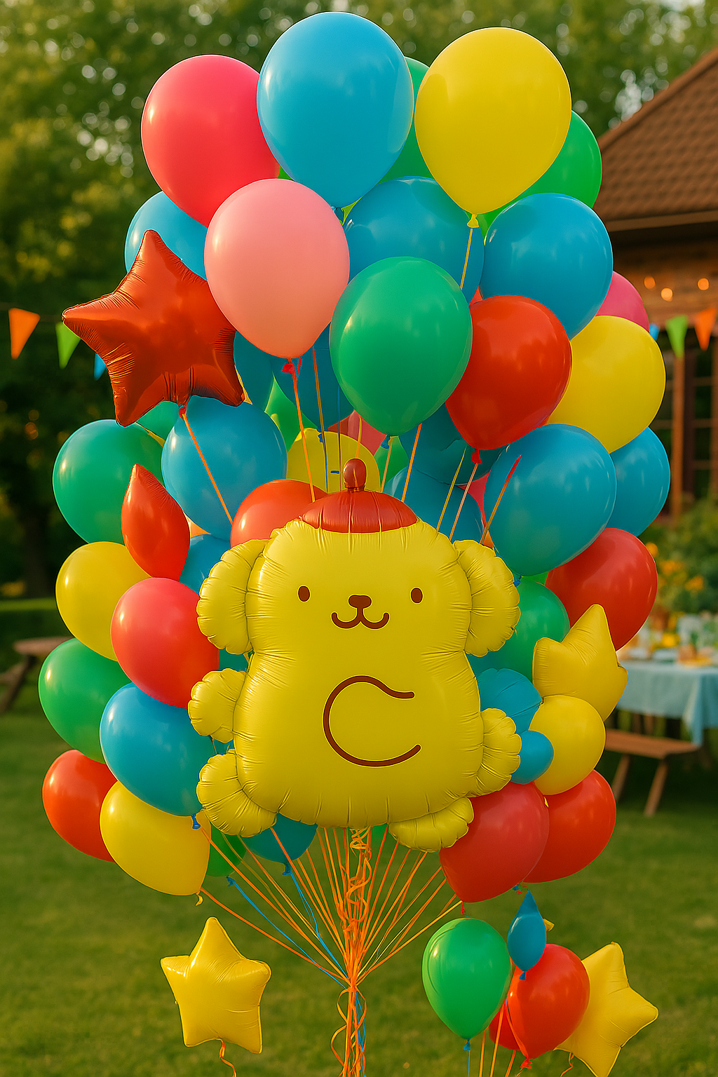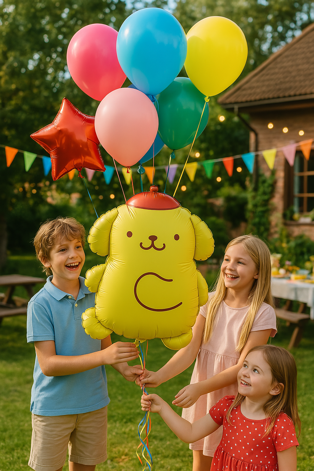 - Balon foliowy w kształcie Pompompurina, uroczego żółtego pieska z brązowym beretem.