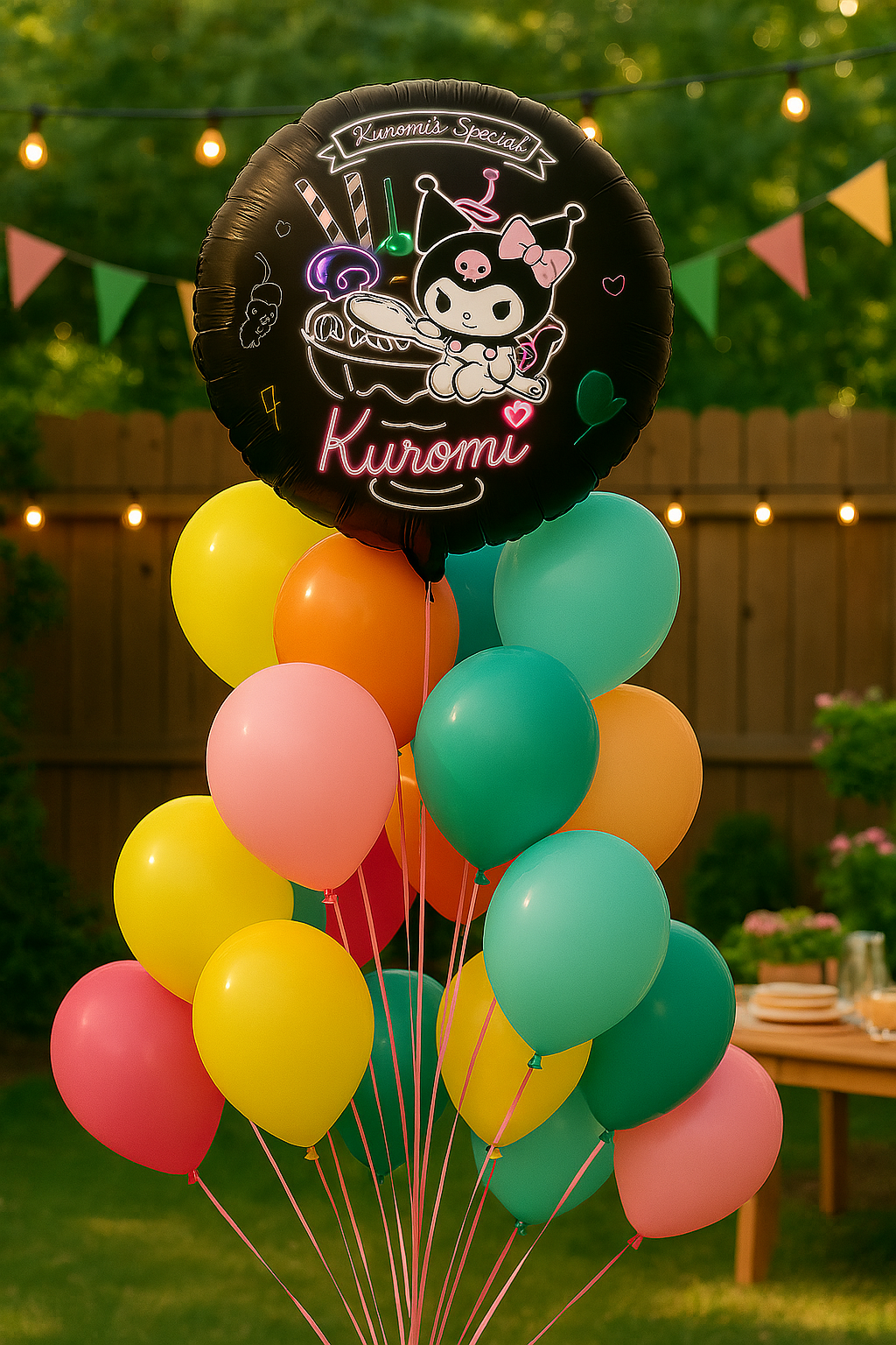- Balon foliowy z postacią Kuromi, ozdobiony neonowymi grafikami.
