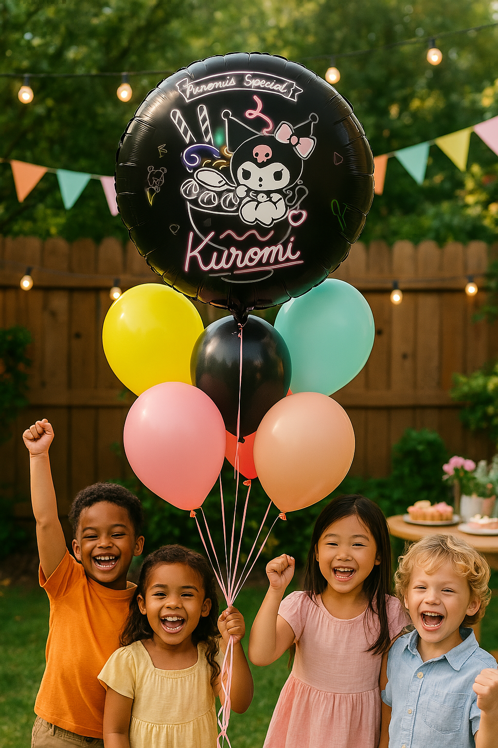 Balon foliowy w kolorze czarnym, przedstawiający postać Kuromi, popularną postać z serii Sanrio. Kuromi jest ubrana w charakterystyczny strój z różową kokardką i czaszką na czapce. Balon jest ozdobiony neonowymi grafikami, w tym napisem "Kuromi" oraz różnymi elementami dekoracyjnymi, takimi jak lody, serca i inne symbole. Balon jest interesujący ze względu na swoje żywe kolory i popularność postaci Kuromi wśród fanów kultury kawaii.