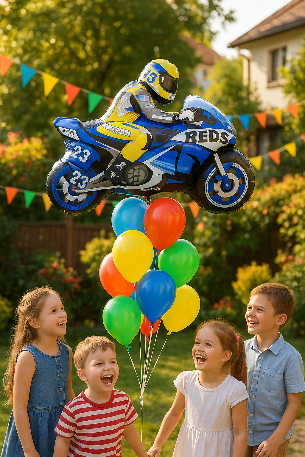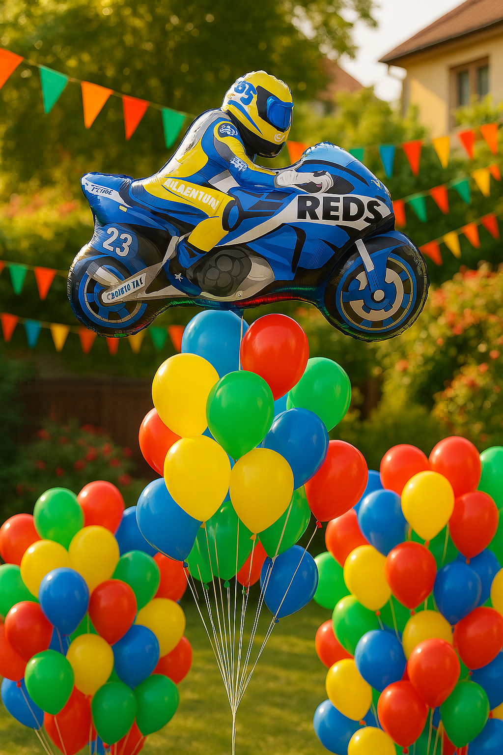 Balon foliowy w kształcie motocyklisty na sportowym motocyklu, wykonany z kolorowego materiału. Motocyklista ubrany jest w żółty kombinezon z napisem "Millenium" na plecach oraz kask w tych samych barwach. Motocykl jest w kolorach niebieskim, czarnym i białym, z dużym napisem "REDS" na boku. Na motocyklu widnieje numer 23, a także inne napisy, takie jak "Hardriver" i "Espoir". Balon jest szczegółowo wykonany, co sprawia, że jest atrakcyjny wizualnie i idealny na różne okazje, takie jak urodziny czy imprezy tematyczne.