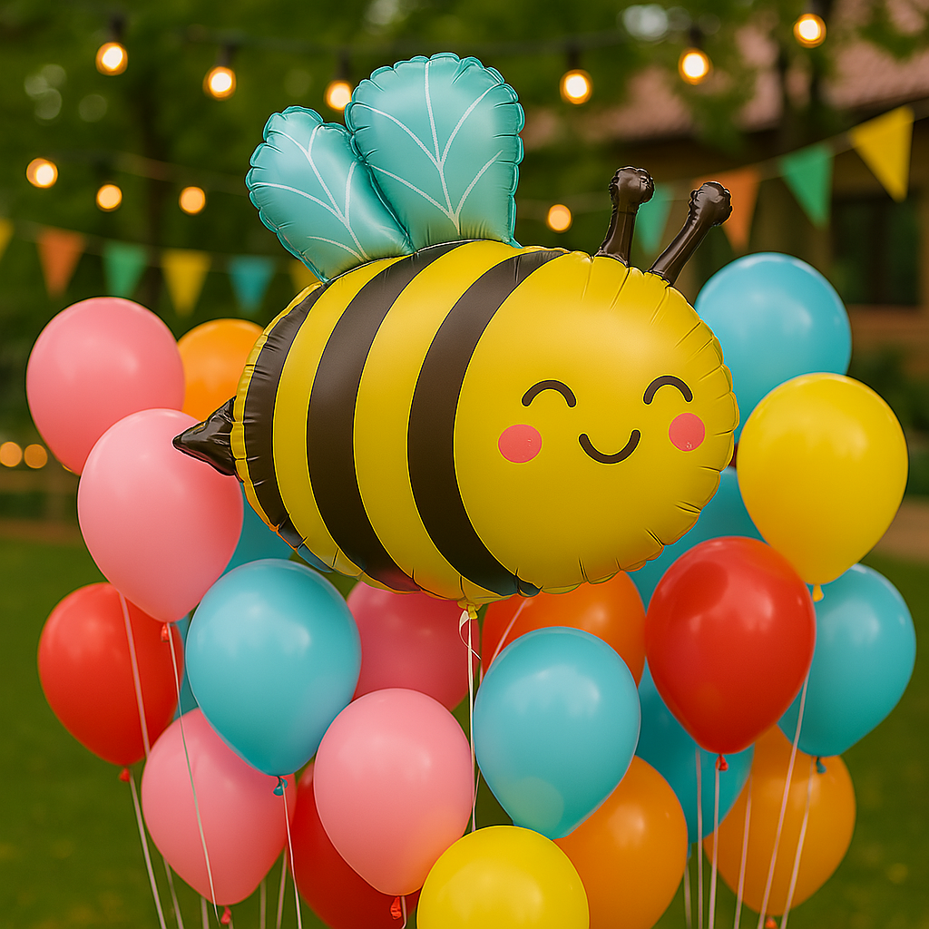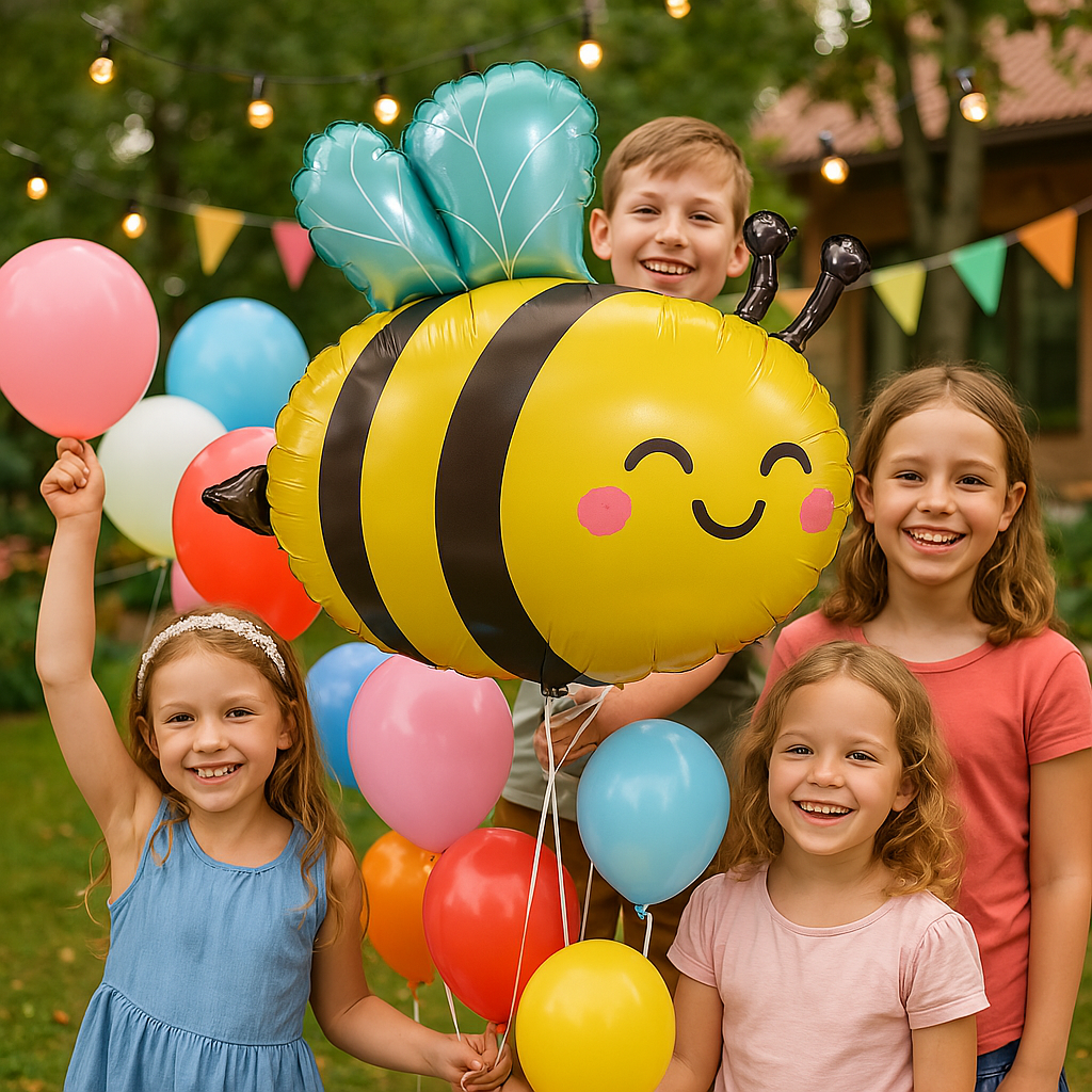 Balon foliowy w kształcie pszczółki, idealny na różnego rodzaju przyjęcia, urodziny, baby shower czy inne okazje. Balon ma żółty kolor z czarnymi paskami, zielone skrzydełka oraz uśmiechniętą buźkę z różowymi policzkami. Wykonany z wysokiej jakości folii, która zapewnia długotrwałe utrzymanie powietrza. Balon można napełnić helem lub powietrzem. Dodaj odrobinę radości i koloru do swojego przyjęcia z tym uroczym balonem pszczółką!