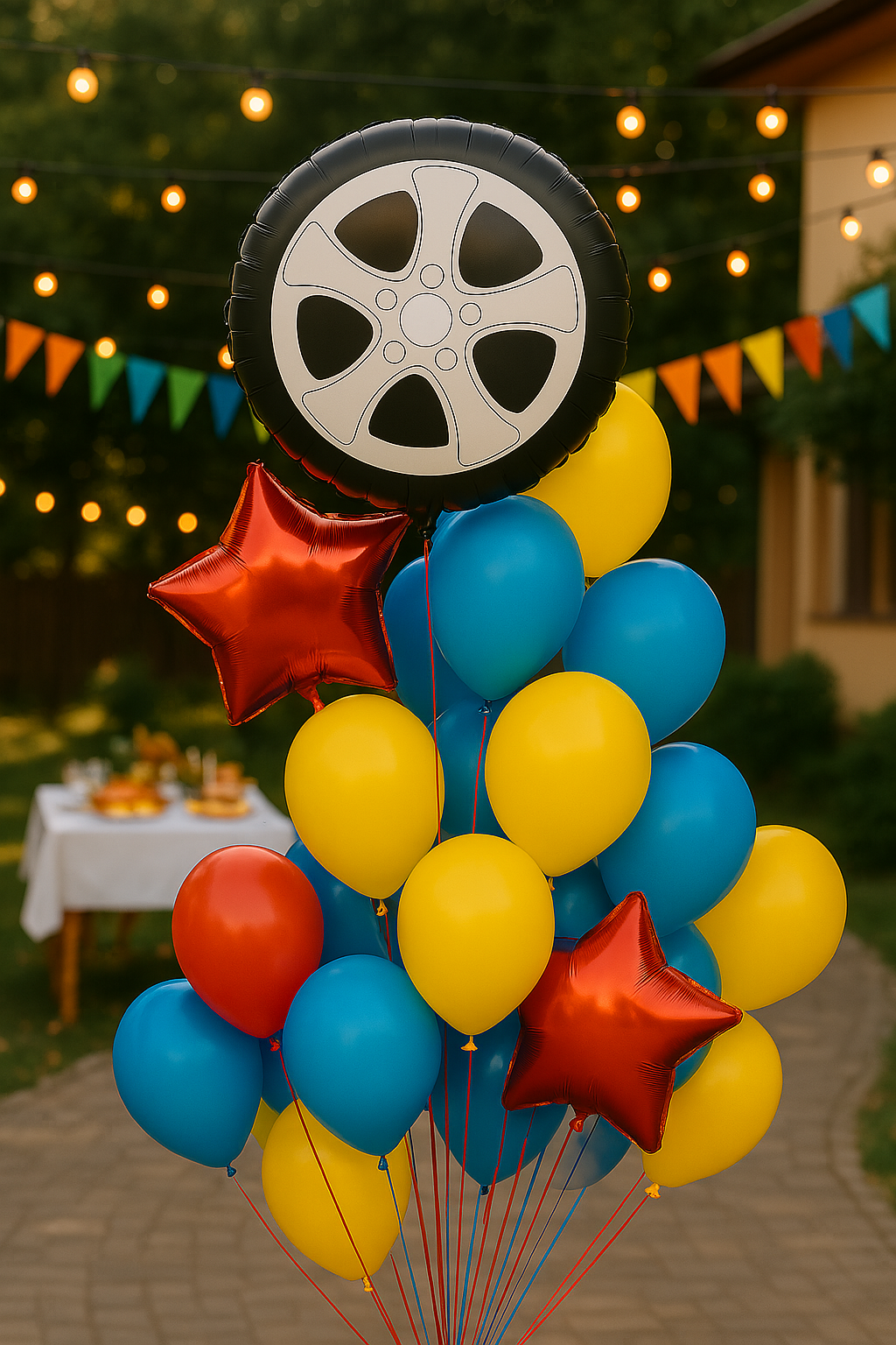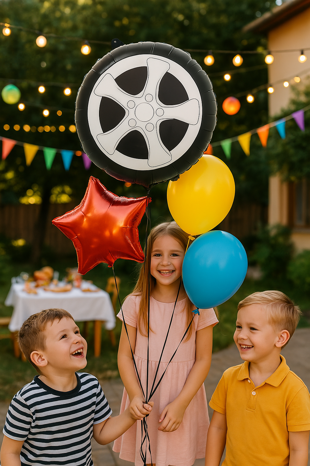 Фольгована повітряна кулька у вигляді автомобільної шини. Куля має круглу форму та чорний колір з білими елементами, що імітують автомобільні диски. У нижній частині балона знаходиться клапан для наповнення повітрям або гелієм.