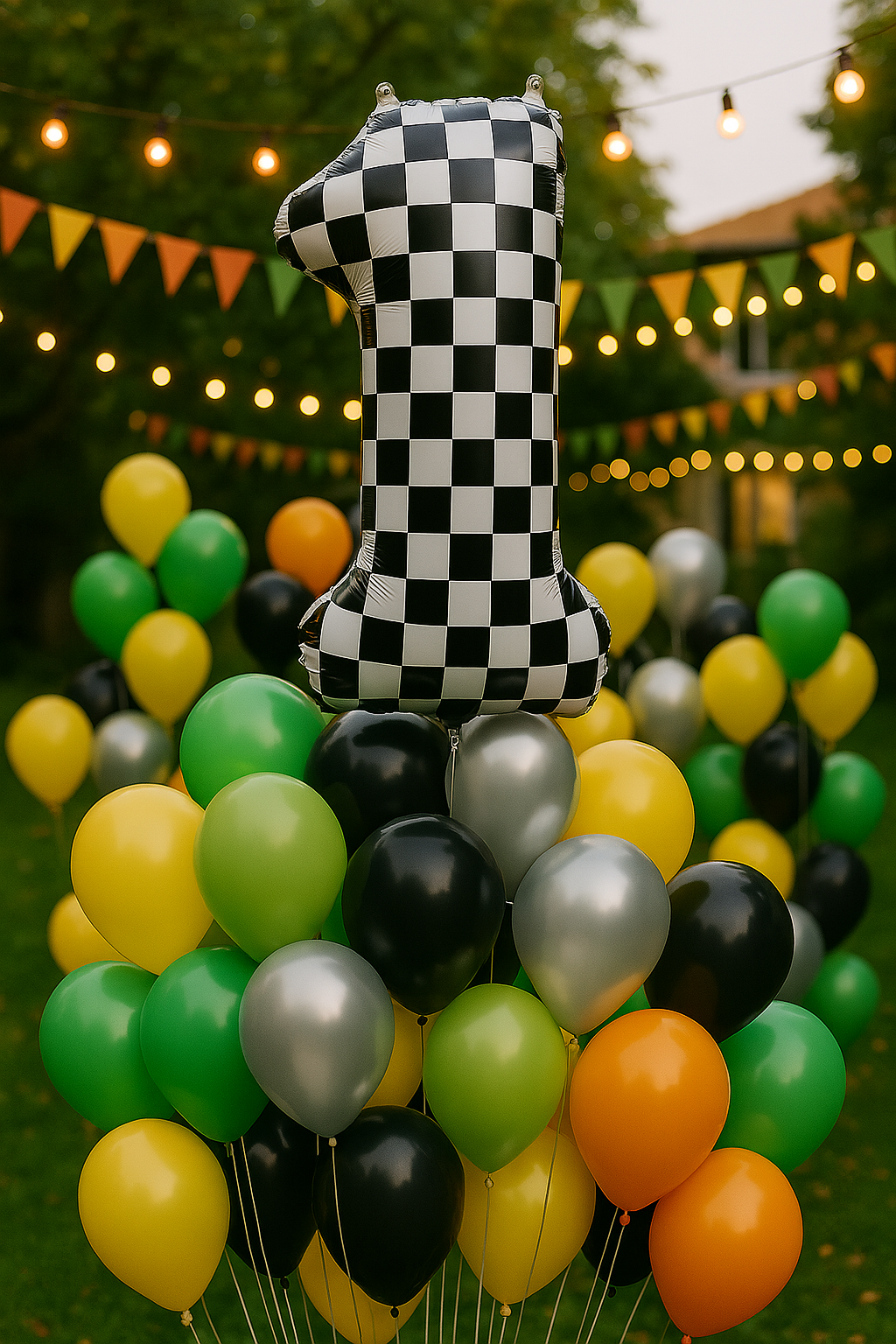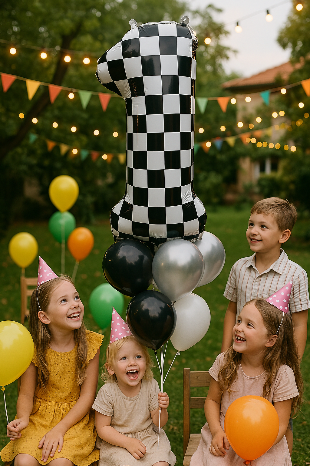 - Фольгована повітряна кулька у формі цифри 1, прикрашена чорно-білим шаховим візерунком.