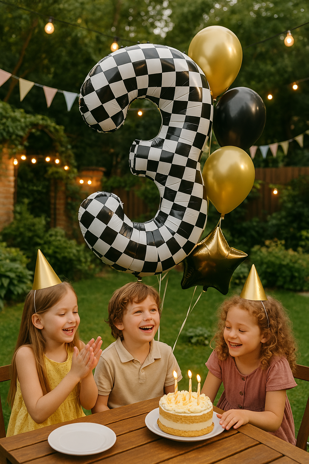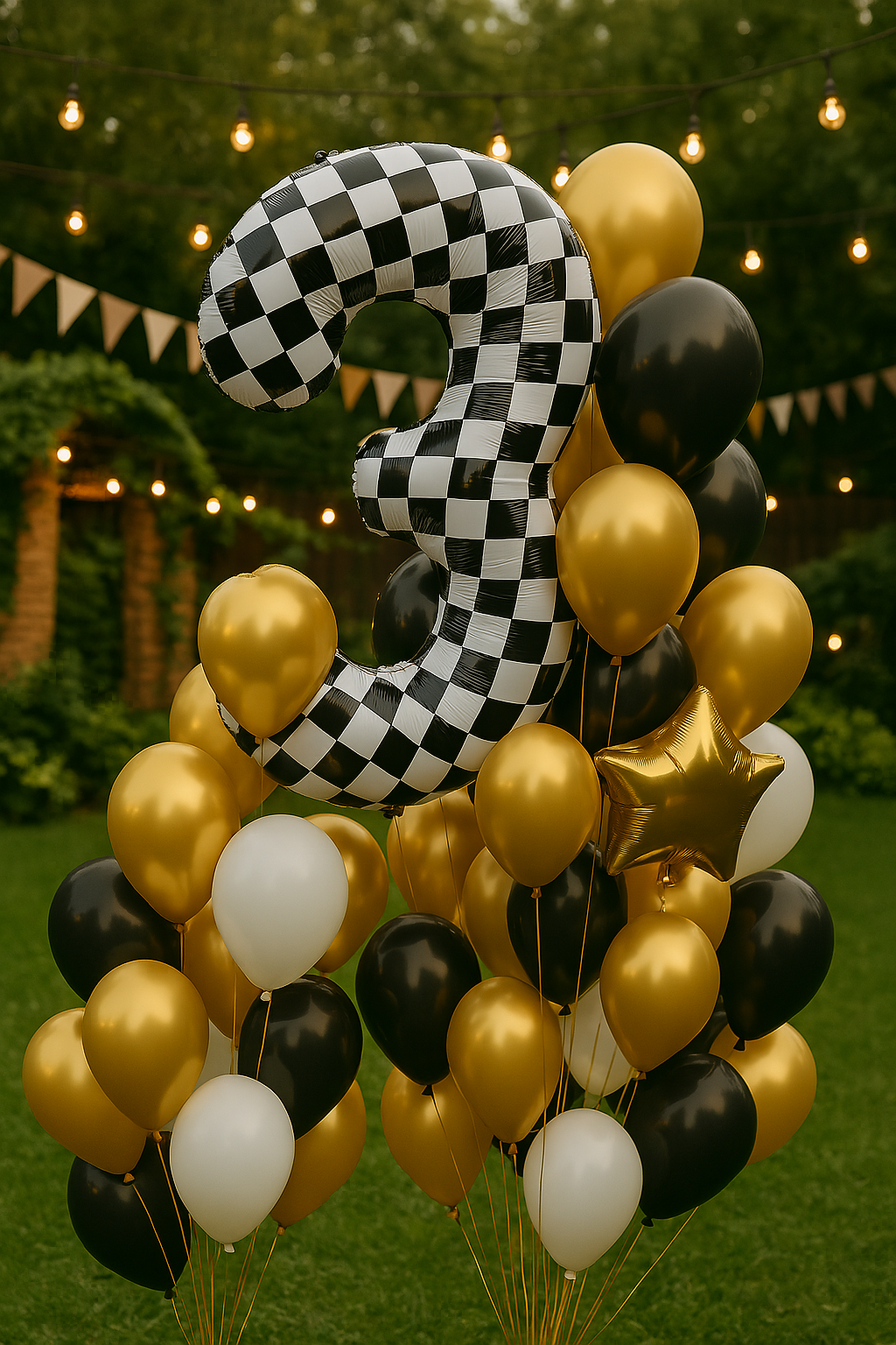 - Фольгована повітряна кулька у формі цифри 3, прикрашена чорно-білим шаховим візерунком.