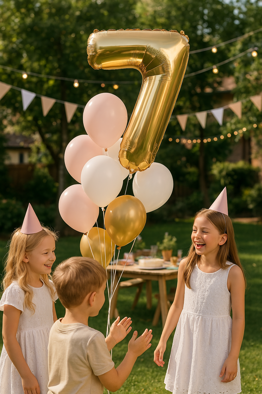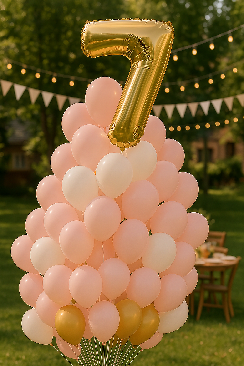 Фольгована куля у формі цифри 7 у кольорі шампань, висота 100 см. Ідеально підходить для всіх видів святкувань, таких як дні народження, ювілеї або тематичні вечірки. Куля може бути наповнена гелієм або повітрям. Виготовлений з міцного матеріалу, що забезпечує тривале збереження форми та кольору. Чудово підходить для оформлення інтер'єру та фотосесій.