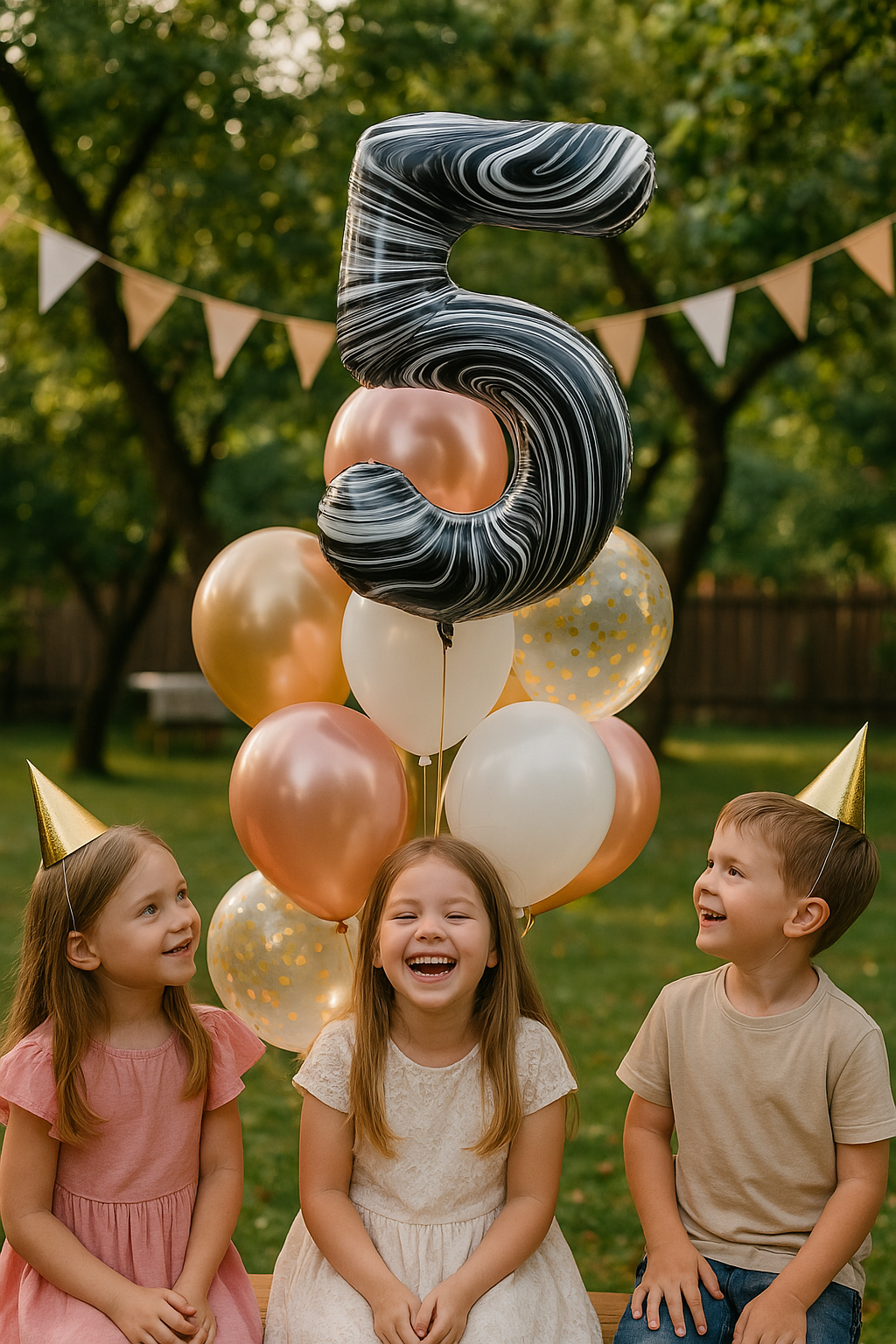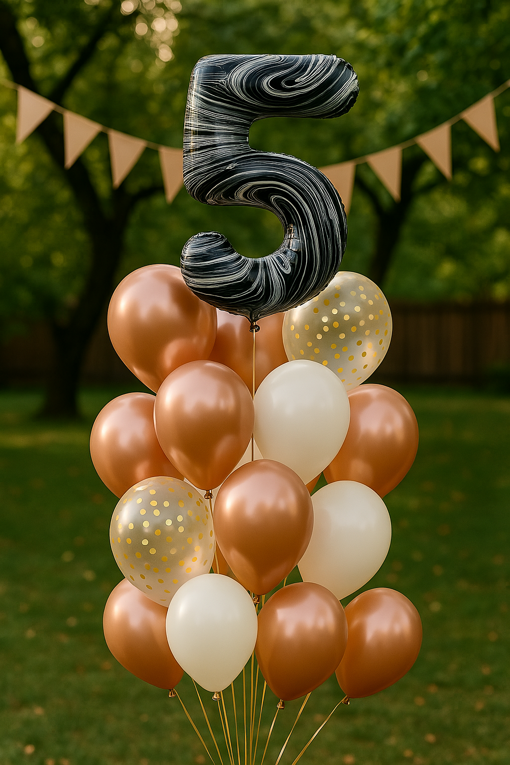 Фольгована повітряна куля у формі цифри 5 в кольорі Marbled, висотою 100 см. Ідеально підходить для всіх видів святкувань, таких як дні народження, ювілеї або тематичні вечірки. Куля може бути наповнена гелієм або повітрям. Виготовлений з міцного матеріалу, що забезпечує тривале збереження форми та кольору. Чудово підходить для оформлення інтер'єру та фотосесій.