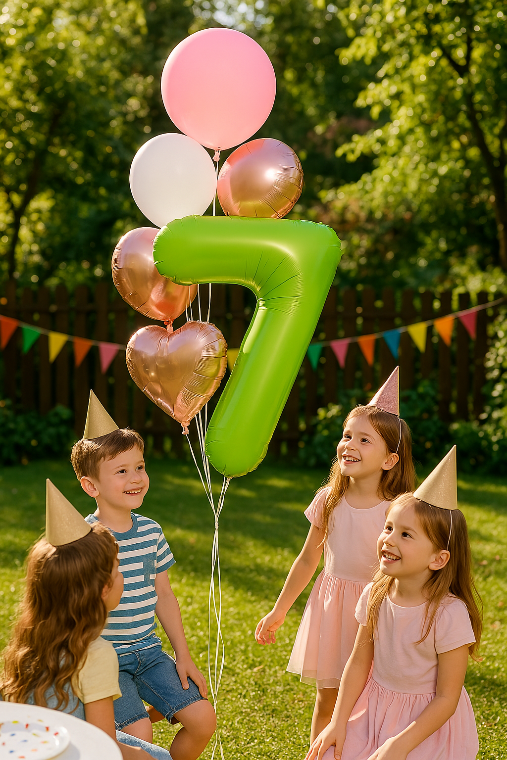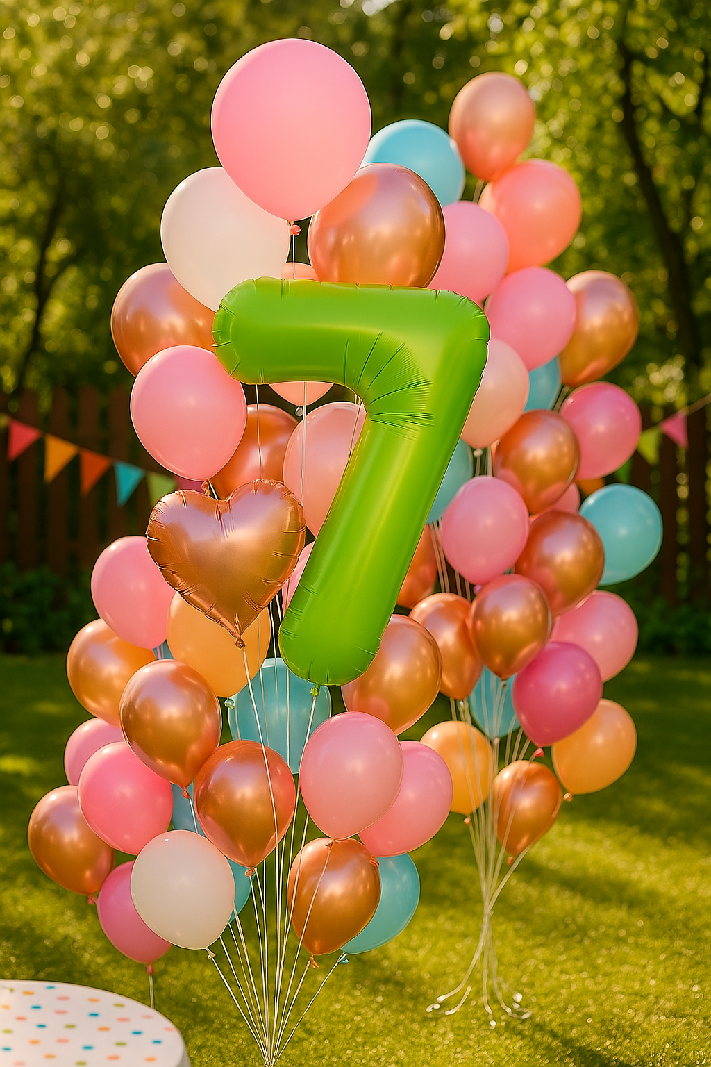 Фольгована повітряна куля у формі цифри 7 в неоновому зеленому кольорі, висота 100 см. Ідеально підходить для всіх видів святкувань, таких як дні народження, ювілеї або тематичні вечірки. Куля може бути наповнена гелієм або повітрям. Виготовлений з міцного матеріалу, що забезпечує тривале збереження форми та кольору. Чудово підходить для оформлення інтер'єру та фотосесій.