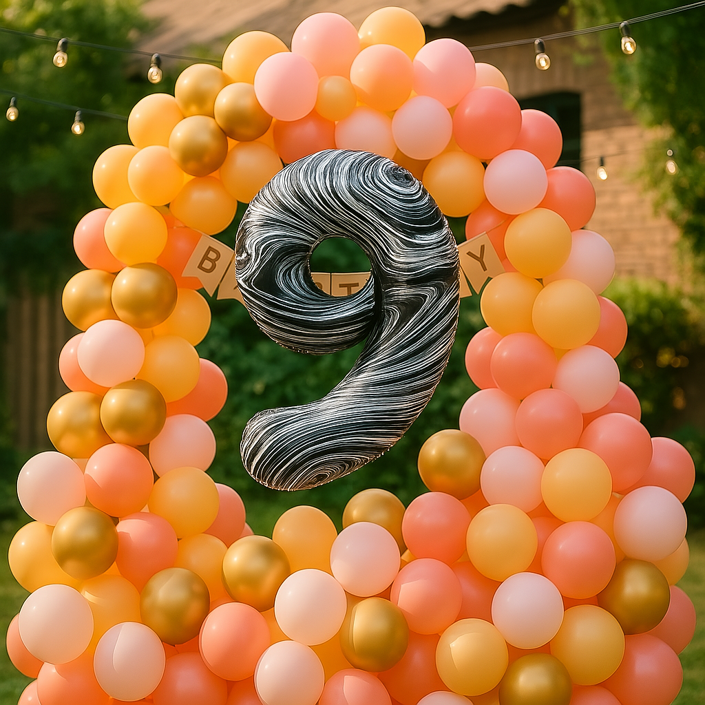 Фольгована повітряна куля у формі цифри 9 у кольорі Marbled, висотою 100 см. Ідеально підходить для всіх видів святкувань, таких як дні народження, ювілеї або тематичні вечірки. Куля може бути наповнена гелієм або повітрям. Виготовлений з міцного матеріалу, що забезпечує тривале збереження форми та кольору. Чудово підходить для оформлення інтер'єру та фотосесій.