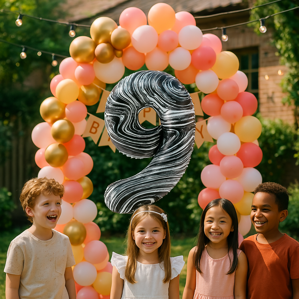 - Фольгована кулька "9" Мармурова (100 см) - велика фольгована кулька у формі цифри 9, ідеально підходить для композицій з цифр та прикрас на різні випадки життя.