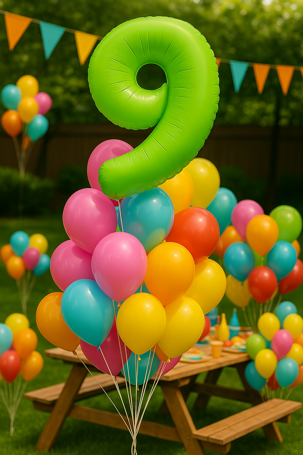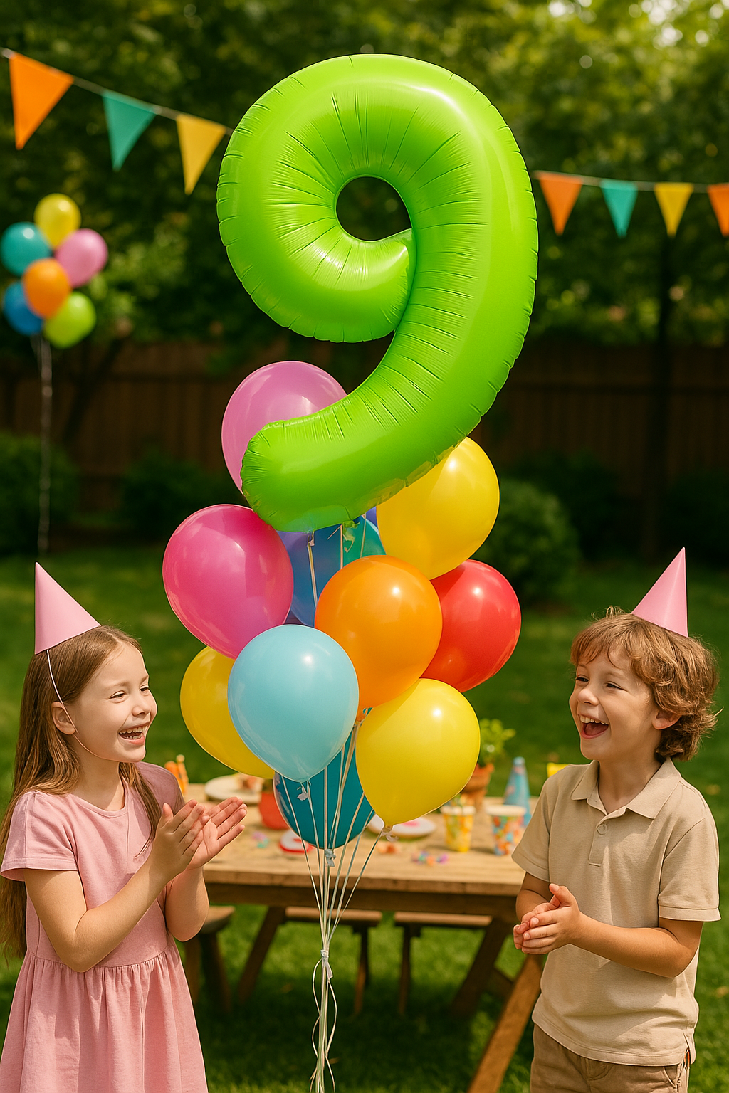 Фольгована повітряна куля у формі цифри 9 в неоновому зеленому кольорі, висота 100 см. Ідеально підходить для всіх видів святкувань, таких як дні народження, ювілеї або тематичні вечірки. Куля може бути наповнена гелієм або повітрям. Виготовлений з міцного матеріалу, що забезпечує тривале збереження форми та кольору. Чудово підходить для оформлення інтер'єру та фотосесій.